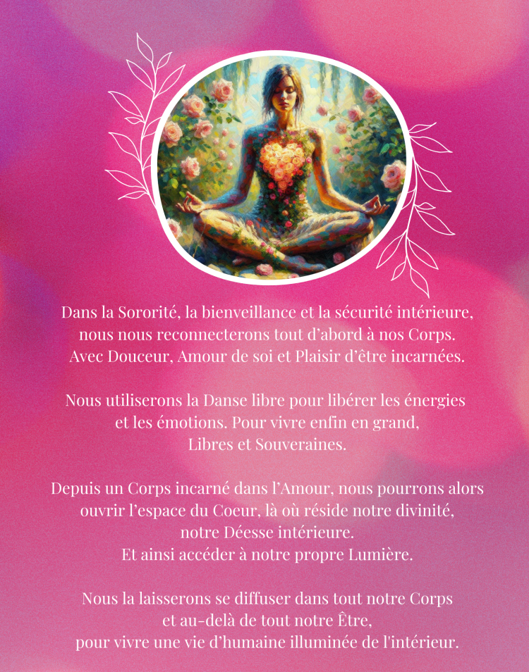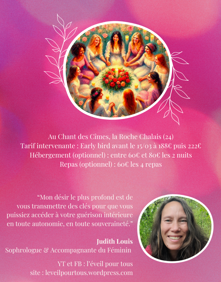 Je serai son assistante, son alliée durant ces 2 journées, pour qu’elle laisse libre cours à ses magnifiques élans et talents d’accompagnatrice des Femmes.